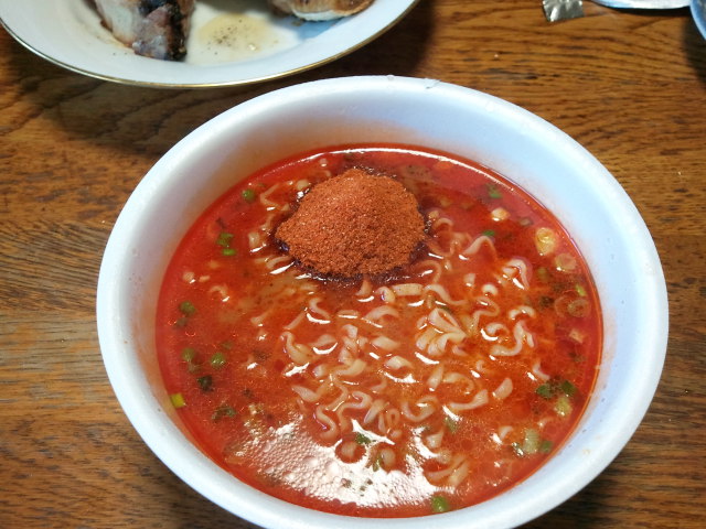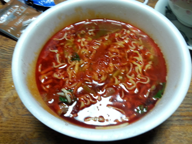 カップ麺独特の薬臭い豚骨の匂いが凄いした。赤いのはただのラー油で辛さも普通。これは失敗やろ。