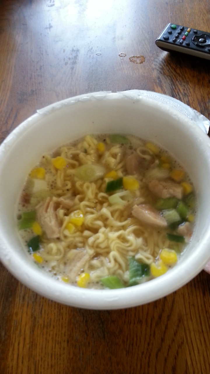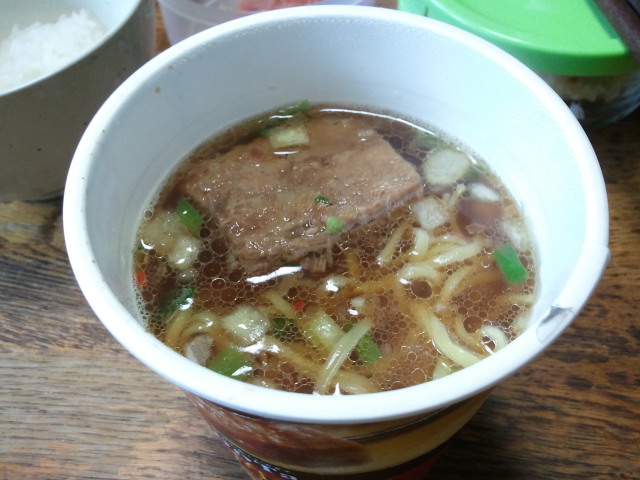 見たとおりデカイ肉が入ってる。勿論合成肉だが悪くはない、麺は太麺なので4分、スープも悪くない。総合的には良いんだけど、前みたいにワンランク上の豪華さみたいなのがちっちゃいカップになって薄れてる、個人的には微妙と言わざる負えない。