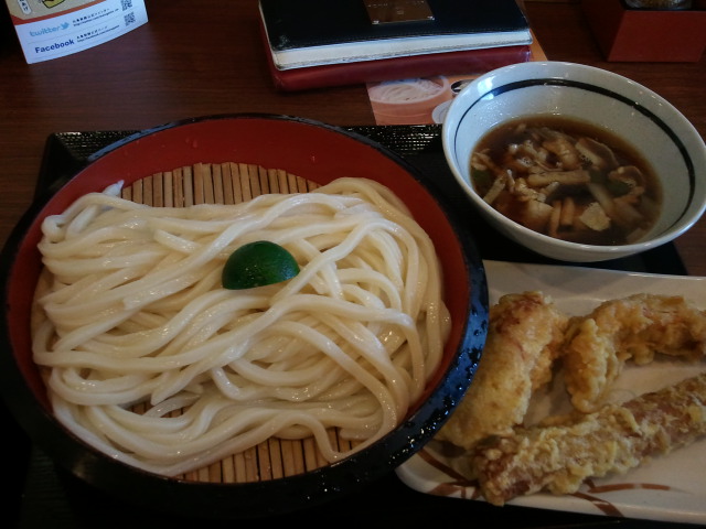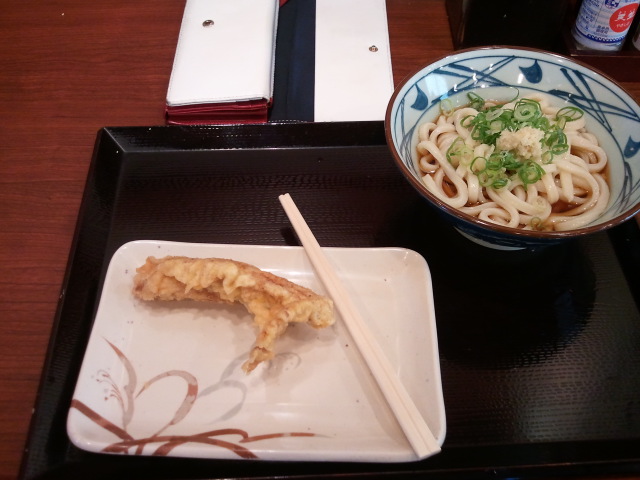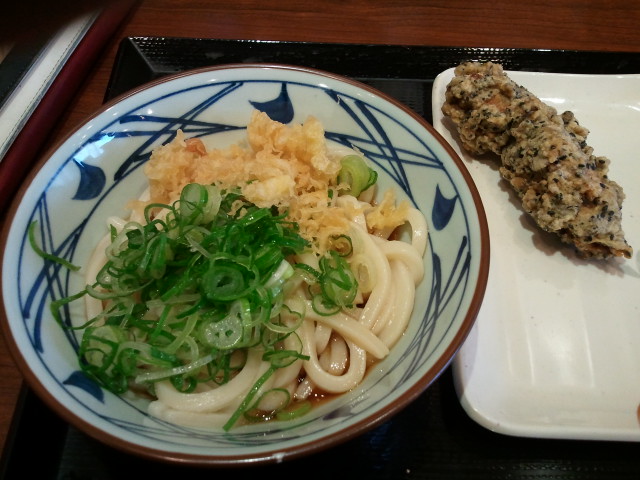 秋の季限メニューかなにか。豚葱の味付けで美味い、ザルにしたけど釜揚げでも良かった。最近の丸亀製麺は冷たいうどんが硬い。後、ちくわ天は磯辺揚げだったらもっといいのに。