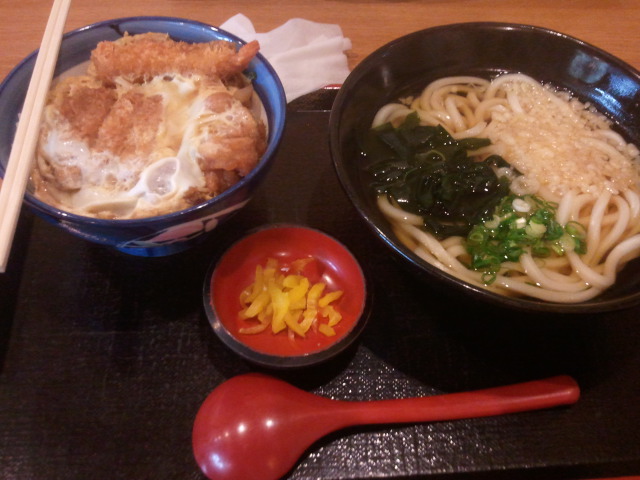 海老天、とんかつ、唐揚げの3つ丼があわさってるどんどこ丼、セットでうどんが付いてくる。味は普通に美味しいレベル。どうやら地方限定っぽいのか?