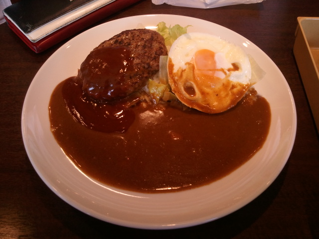 カレーの上にレタス、目玉焼き、デミグラスゾースのかかったハンバーグが乗ってる。意外とレタスが良いアクセントで美味かった。目玉焼きとハンバーグのカレーとも相性もよく、デミグラスソースもハンバーグと合ってて美味い。ただ、デミグラスソースとカレーが合わなかった、できるだけ混ざらないようにハンバーグで使いきって食べることをオススメする。