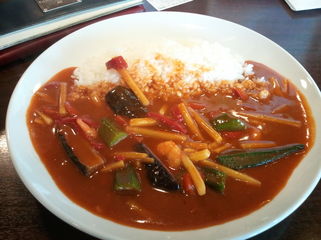 キャンペーンの2つ目のカレー。普通に2辛弱くらいの辛さがあった、少なくとも1辛よりはあると思う。ナスピーマンオクラタケノコエビが具材で使い回し感は否めない。ココナッツ風味がするので苦手な人は注意やね。若干タケノコが硬く感じた。